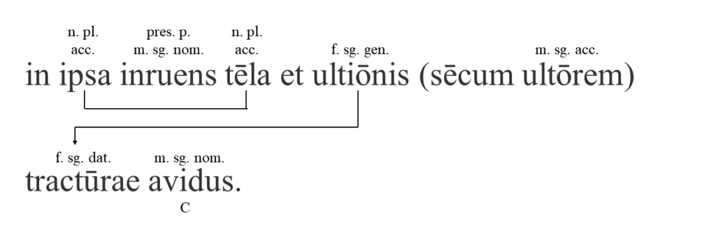 in ipsa inruens tēla et ultiōnis sēcum ultōrem tractūrae avidus.