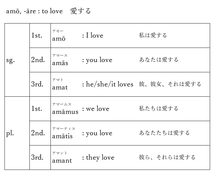 • amōの隣の-āreの部分は、動詞amōの不定法(英語でいうところの不定詞)がamāreという形であることを示すが、詳細は後述